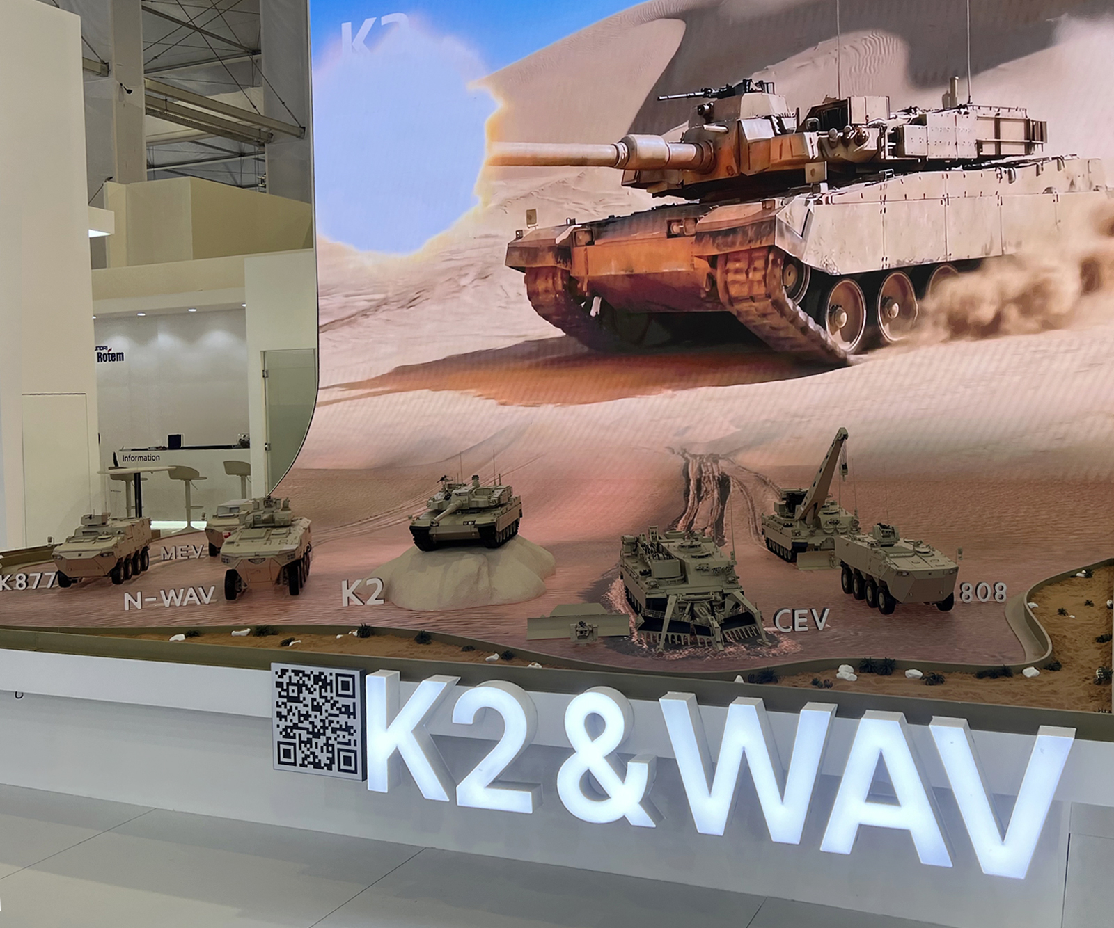 전차 계열화 전략을 명확히 드러냈습니다. 사우디 작전 환경을 반영해 현지화한 K2 전차를 주력 플랫폼으로 제시하고, 여기에 구난전차(ARV), 장애물개척전차(CEV)를 포함한 이른바 ‘K2 패밀리’를 함께 소개했습니다. 전차 한 대의 성능을 강조하기보다, 기갑 전력 운용 전반을 하나의 체계로 설명한 구성이었습니다.